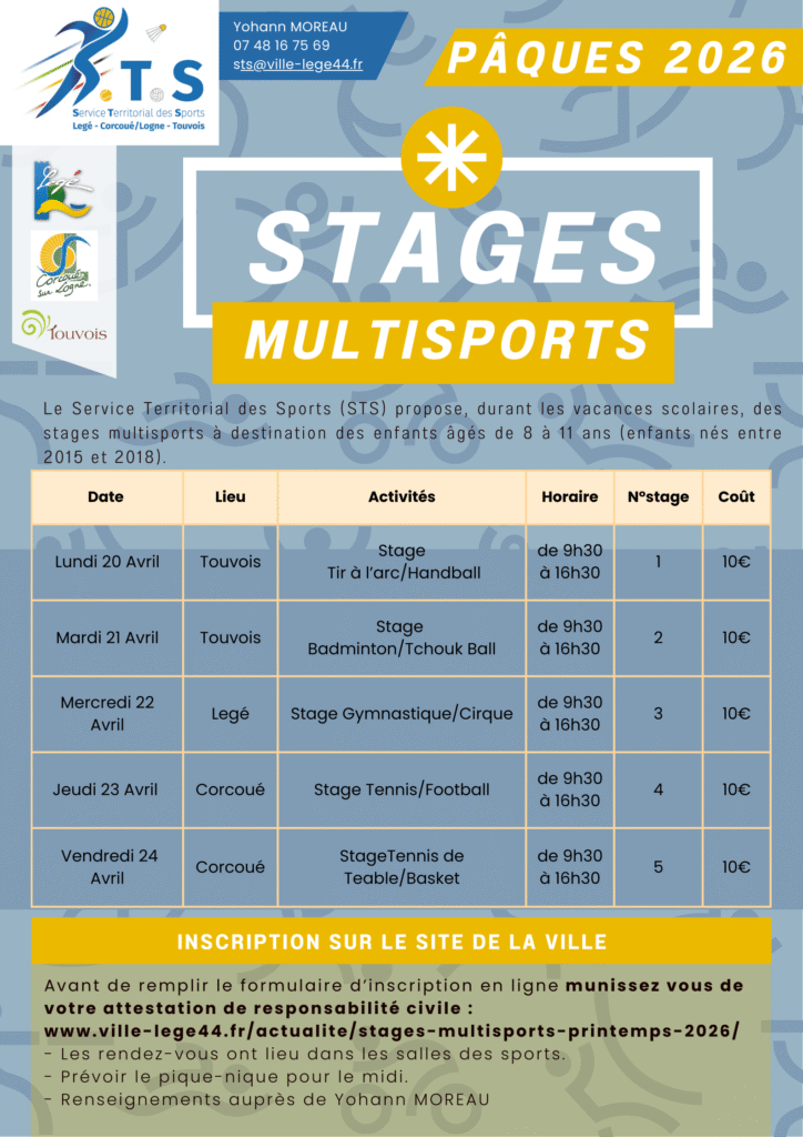 Les communes de Legé, Corcoué et Touvois se sont associées pour la création d’un Service Territorial des Sports (STS). Ce nouveau service propose : – des stages multisports à destination des enfants âgés de 8 à 11 ans (enfants nés entre 2015 et 2018) durant les vacances scolaires. L’objectif étant de pratiquer des sports présents sur le territoire, mais également d’en découvrir d’autres moins connus. Ces stages sont encadrés par Yohann MOREAU, Educateur Sportif STS. Règlement du stage par espèces ou chèque uniquement, à donner le premier jour du stage. Ordre du chèque : Régie STS